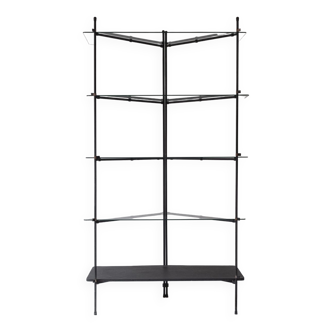 Very rare 'Angelo Necessario' Wall Unit, designed by the design duo Paolo Palucco & Mireille Rivier Italy 1989. The duo is known for their particularly brutal and radical furniture. Their creations are driven by a unique vision of furniture, blending elements of sculptural artwork with irrational objects. This is the suspended version, which is even more rare. It is made of black lacquered steel with wooden shelves in different depths. Only 2 screws ensure mounting on the wall. It is inspired by Rainer Maria Rilke's Duino Elegies, which depict the death of an angel on a cross with its stylized, open wings. Ingenious design with attention to detail and very well crafted. The unit is in excellent condition. Just a tiny tear in the veneer on one shelf, as visible in the last picture. Futhermore perfect.