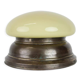 Ceiling light composed of a gold-coloured metal base (showing signs of age) and a frosted glass globe. B22 socket (LED bayonet bulbs are easily available) Diameter: 28 cm. Height: 15 cm. Weight: 1 kg.