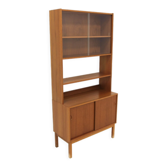 A bar cabinet that serves as a room divider, produced in the 1960s by the former Czechoslovak company Tatra Nábytok. The Monti300 series was designed by František Jirák. This piece combines timeless design with modular ease of use, allowing it to be configured entirely to your liking. It can be placed against a wall without compromising its function, or in the middle of a room with access from both sides. The base cabinet features a storage section with a shelf and a hinged door on each side, next to which is the bar section with a flap that can be opened on either side. This section also makes a great vintage toy chest. The upper elements consist of a display case with sliding windows and a shallow shelf. The entire piece is finished with oak veneer with a semi-gloss lacquer finish. This item is in good vintage condition. Any details or defects are noted in the photos or text.