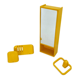 This old piece of toilet furniture or medicine cabinet with retro charm is typical of the 50s with its rounded edges. It was left in its juice with its beautiful white patina. It has a niche with a central mirror presenting the traces of time that give it a lot of charm. The 2 doors hide a beautiful storage space with 2 shelves on one side. The chrome metal door knobs are reminiscent of the vertical chrome strapping of each of the edges. The wardrobe is clean, in good condition with a nice patina.