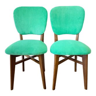 Childish color combination for these two 60s pieces! Ideal chairs for the child's bedroom. Excellent condition of the wood, fully restored: rabbit-type anti-stain fabric, sanded and varnished wood. Dimensions: H: 75 cm, seat h: 43cm. L: 40cm. D: 45 cm. Price per unit, two chairs available.