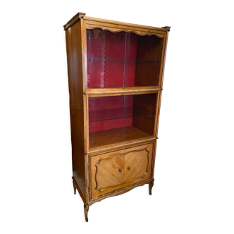 Magnificent curved glass and carved wood display cabinet from 1956. It has been stripped, sanded, waxed, and the top varnished as it had been painted red in its previous life. Its shelves and doors are in very good condition for their age (there is a small nick on the edge of one of the shelves to note). The shelves (which are adjustable) are fixed with original small brass supports. The doors can easily be removed if you prefer - like me - the display cabinet open (for transport, they will also be removed for added safety).