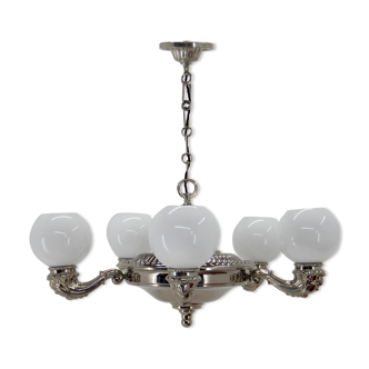Vintage chandelier 1950 in the taste of jean royère. 5 fires, smoked glass globes. Golden chrome plating. Tubular bases in galuchat. Electricity redone.