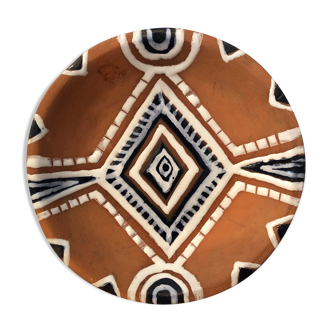 Jean de lespinasse (1896-1979) triangular cup in enameled ceramic with rotating decoration of stylized motifs on a brown background signed under the base diam: 22 cm instagram: galerielademeure.