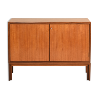 This piece of furniture offers you a great storage capacity behind its 2 large swinging doors. It will find its place in a living room, hall, room or office; it will be suitable for storing dishes as well as stashing folders or clothes. Inside tablets: two tablets on one side, one tablet on the other side. This is a production made of teak wood veneer and not laminate. The furniture dates back to the early 1960s. Designer: pierre guariche. Country: belgium. Manufacturer: meurop. Period: 60's. Materials: teak veneer, black lace-up steel. Condition: beautiful vintage condition. Dimensions: width: 120 cm, depth: 47 cm, height: 116 cm.