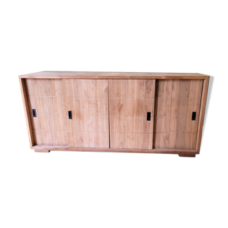 A section of combineurop furniture from the 1960s, composed of a teak veneer box, surrounded by massif, resting on a pair of metal ladders. The cabinet initially opened with a lid, tinkered at the closing, replaced by 2 laminate / formica panels from the same period. The rails, sliding parts and buttons are new. The interior of the box was covered with fine plywood hiding the footprints of the original elements. Some slight marks, traces and lack of paint.
