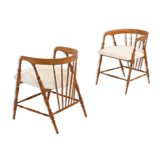 Pair of rattan chairs sold with its bedside that can serve as a small table in very good condition. Chair dimensions: seat height: 43cm. Backrest height: 93cm. Width: 41cm. Depth: 39cm. Bedside dimensions: height: 50cm. Width: 34cm. Length: 44cm.