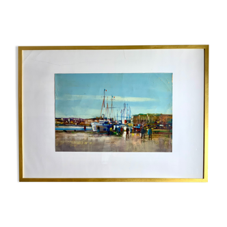 Painting representing a moored boat signed r.aumola. Very beautiful beige and gray frame, bringing out the colors of the painting perfectly. Dimensions with framing. Length 43 cm. Width 36.5 cm. Depth 3.5 cm.