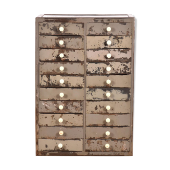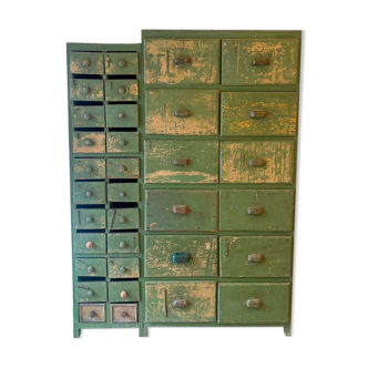 Magnificent trade / workshop furniture in its water green patina. With its 16 drawers and 4 niches it will be ideal for storing all your stuff, in an entrance hall, a living room, a kitchen… Very pretty original shell handles. The furniture has been treated against woodworms, cleaned, repainted in places, the inside of the drawers has been painted. The furniture measures. 131 cm high. 81.5 cm wide. 45 cm deep. Height of the drawers 10 cm. Height of the lower niches 27 cm. Do not hesitate to consult my other ads; ).