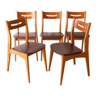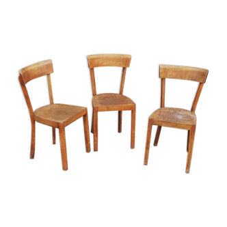 Set of 4 chairs from the 80s. In solid pine, "golden honey" color. Seat height 44.5cm thickness 3cm. Traces of time... (details on photos).