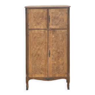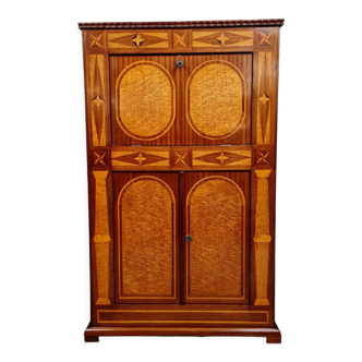 Elegant antique secretary in Louis XVI style, crafted in the 19th century, with understated and perfectly balanced lines, typical of this timeless style. The central panel is adorned with figurative marquetry representing a music trophy, an emblematic motif of the Louis XVI style, adding refinement and personality to the whole piece. The leather-covered flap opens to form a comfortable desk, revealing a well-compartmentalised interior, consisting of shelves and small drawers. It is complemented by a large drawer at the top and two doors at the bottom (with shelves), all enhanced with decorative bronze fittings (lock entries and medallions), characteristic of the style.