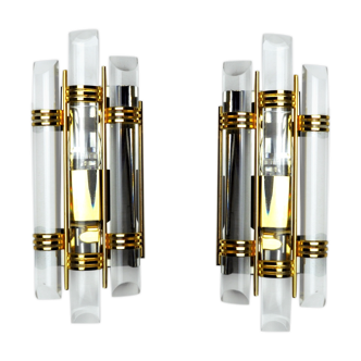 2 pairs of veca wall lamps produced in italy in the 70s, they are each composed of 7 two-tone glass plates fixed on a chromed metal structure. Beautiful quality of manufacture, the chrome is intact, 2 plates have very small gins, the upper part of one of them is broken and missing (photo) but not very visible, you have to know it to see it. They have been completely dismantled to be cleaned, the electricity has been checked, screw socket small cap, bulbs provided. Height: 28 cm width: 16 cm depth: 10.5 cm weight of a wall lamp: 1.6 kg.