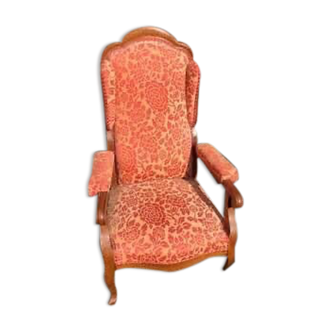 Style armchair completely redone in a traditional way (horsehair springs), covered with a fabric from casal, brown flowers on a beige background. The seat is very wide (54 cm wide by 60 cm deep). Seat height 38 cm. Dimensions: total width 75 cm, depth 80 cm and height 94 cm. Waxed feet.