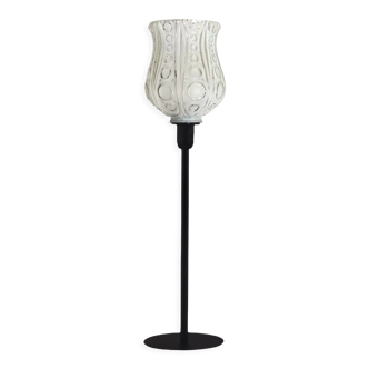 Don't blame us... Lately, we've been obsessed with gold lampshades, with varied textures and shapes. This lamp is made with the lampshade of an old pendant light in streaked and gilded glass. It was hidden in its metal frame. When we turned it over, dug it out and cleaned it and were amazed by the results. All that was needed was to mount it (on a gold metal foot ; ) - but we can mount it on a black metal foot if you wish - ) and... Tadam! Here is the result ! The electrical system is new. Shade height: 17 cm. Lamp height: 45 cm. E14 LED bulb not included. We recommend an LED bulb which consumes less energy and is more resistant over time.