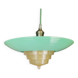 Superb pendant light typical of the 1960s design, in original white lacquered metal to clean or customize according to your color preferences. Composed of 5 deflector rings. This luminaire offers a powerful and soft light, without glare, creating a warm and refined atmosphere in any space. This piece combines quality construction with a vintage aesthetic, ideal for retro design enthusiasts or to bring a touch of charm to a modern interior. As is, checked and in working order. Classic screw e27 LED bulbs. Dimensions: deflector: diameter: 47 cm, height: 30 cm. Total height: 50 cm (with stem). Also available in blue or orange colors to see in my other listings. Add a retro touch to your decoration with these vintage pendant lights, in their original state or customized to your taste.