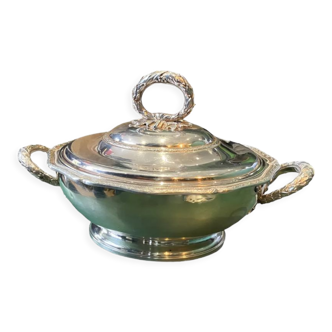 Silver metal ice bucket with pearl row decoration on the upper edge and on the edge of the pedestal, the grip of the lid is artichoke-decorated and the handles are decorated with acanthus leaf. It is in good condition.