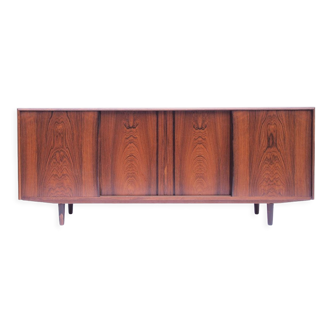 Sideboard with two sliding doors, rosewood veneer. Art deco spirit base in chrome finish. Clean line, solidity, manufacturing dates back to the 60s. In good condition despite slight claws on the tray, the veneer has some defects, it is missing on a small low rear part, which is almost not noticeable and a shine placed on the left front foot.