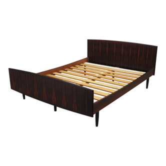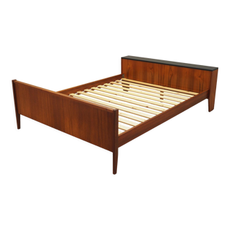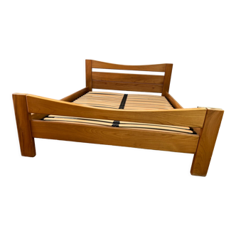 Bed 70s. Sleeping in 140, solid wood, extendable box spring provided. Light swordfish green paint and wear effects on the corners. 2 reading lamps, this piece of furniture requires a fairly large ground occupation for its enhancement (see dimensions). Removable: 4 pieces for the bed and 2 for the box spring.