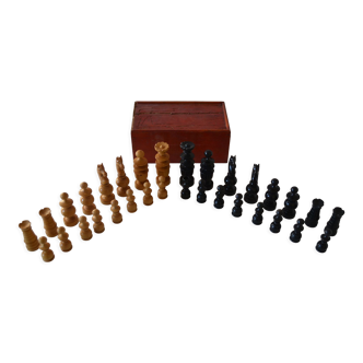 This superb antique chess set in turned wood features a design inspired by the staunton model, a classic reference prized by players and collectors. Complete, it includes a 7 cm king and 3.2 cm pawns, ensuring excellent handling and perfect readability on the chessboard (not supplied). The pieces, in excellent condition, are finely turned and carved, with a natural contrast between light and dark wood. They are carefully stored in a sturdy and functional compartmentalized wooden box, which shows visible signs of wear (stains, marks of time), reinforcing its authenticity. This elegant and vintage set will appeal to both chess enthusiasts and lovers of antique objects. Estimated period: first half of the 20th century material: turned and carved wood dimensions of the pieces: king 7 cm - pawns 3.2 cm condition: pieces in excellent condition, box with signs of wear style: inspired by the staunton model special feature: complete set with wooden box.