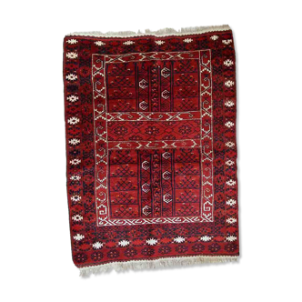 Oriental wool rug in shades of red, brown, and black. Very good condition. Handmade. Dimensions: width: 64 cm; length without fringes: 88 cm; length with fringes: 96 cm.