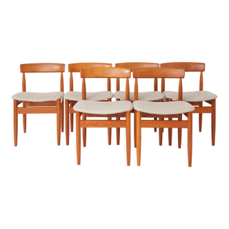 Beautiful set of 4 pine chairs by Vamdrup Stolefabrik (Denmark, 1970s). Beautiful, organic dining chairs crafted from solid pine. Featuring a minimalist design with round seats that highlight the natural grain and character of the wood. They have a generously curved backrest and sturdy cylindrical legs. The seats have been newly upholstered in a beautiful off-white fabric. The chairs are in very good condition.