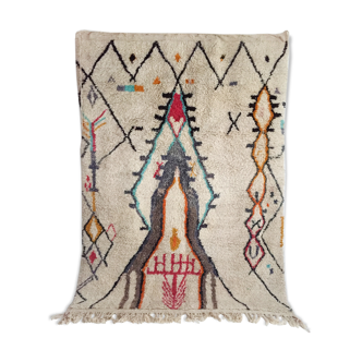 Azilal carpet ivory color from the moroccan middle atlas region. Insulating and soft, the prestigious azilal carpets are made with the finest wool selected by the weavers. They are distinguished from beni ouarain carpets by their colorful and rich patterns. They are canvases for the artistic expression of weavers! This carpet in cotton weft and knots 100% natural wool is entirely hand-woven according to the berber tradition. Dimensions: 216*145 cm. Origin: rabat region. 100% hand-woven. Cotton weft and knots 100% natural wool. New product. Free shipping in metropolitan france. Hand-woven in an artisanal way, carpets can sometimes have asperities of symmetry in their patterns or shape.