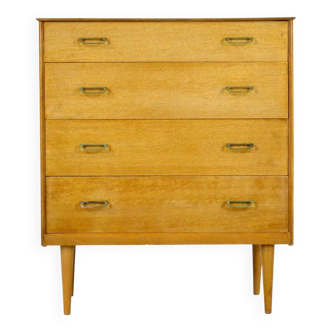 Vintage chest of drawers with tapered legs, solid raw oak, 1960.