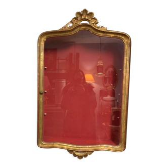 Wall display case for displaying 4 pocket watches (with this display case 3 pocket watches that do not work). Glass dome with hook - to protect pocket watches from dust - wooden base with blood-colored velvet finish and antique-style frame - h 27.5 mm - l 23.5 mm - thickness 5 mm.
