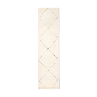 The large, archaic looking, white-ground rug known as the beni ourain is the creation of morocco’s mountain nomads. The thick, but loosely structured rugs were not used as a floor covers, but rather as beds and bedding. Efficient protection against the winter cold in snowy highland areas, the classic beni ourain features a network of black lines on a cream ground. The oldest rugs of the beni ourain have extremely rich designs.