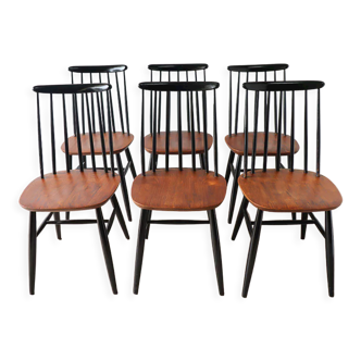 Beautiful set of four dining chairs in a vintage style from the 1960s. A gentle blend of clean lines and functionality, they will fit perfectly around both modern and retro dining tables. Made of solid beech with a slatted backrest and original black lacquered legs. They are stable and sturdy, in good condition with signs of everyday use such as slight scratches, but nothing serious (see photos).