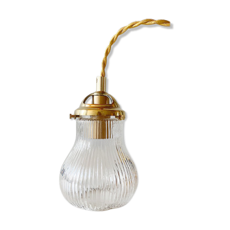 Very fine glass, without crack or shine. Socket and electric thread in new textile, claws of yesteryear (the 2 claws are slightly different, visible in the photos). 12 cm high (not counting the height of the socket), 9.5 cm in diameter at the widest. 68 cm of wire. Functional.