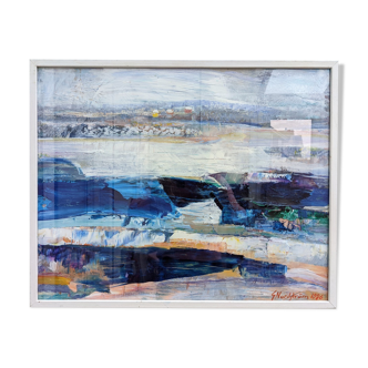 Vintage mid century framed oil painting, abstract coastal landscape - icy winter