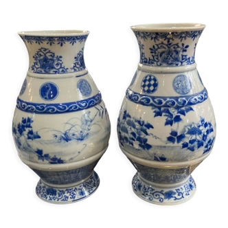 Charming pair of antique table pieces in porcelain with hand-painted cobalt blue floral decoration on a bright white background. The brushwork and the plum blossom patterns evoke the classic style of Delft porcelain or mid-20th century Asian artisanal productions. These items date from the 1960s and will add a touch of vintage elegance to your table setting. Impeccable condition, with no chips or cracks. Height: 6.5cm Diameter: 6cm.