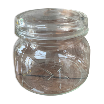Round glass candy box, embossed fruit decoration, airtight cap (food grade), capacity 2 liters in very good condition. Diameter 16 cm, height 21 cm, weight 1,085 kg.