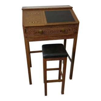 Superb wooden schoolmaster desk desk. The tray is slightly inclined and opens in 3 separate parts with a large storage capacity. It also has 2 large drawers. It is in very good condition with a pretty patina and traces of time that give it all its charm. The buttons on the drawers are different. The stool is not sold with the desk but you can find it on the site. Height highest side 87cm / height lowest side 78cm.
