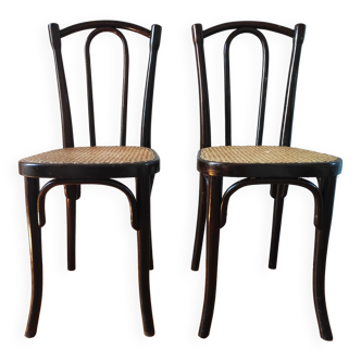 Pair of bistro chairs type n° 56 cans, with connecting arches of the legs. Around 1925/30. The cannages are in perfect condition, tensioned, without hitch. Seat height: 46 cm - total height: 85 cm- seat: 35x37 cm. Stable and solid chairs ready to serve. We can equip these chairs free of charge with screwed skates (origin Germany), adapted by their material to the coating of the room where they will be used. Work done after purchase. More photos and information on request. Secure delivery France and Europe or collection Alsace.