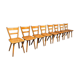 Old barter chair, in addition to being super beautiful, the armchairs are comfortable thanks to their colorful skaï seats. Legrand design presents these pretty retro colors of the 1950s and 1960s, soft and bright golden wood shade. Finesse and light lines for this model with a scandinavian and baumann look. Tapered compass feet, backrest with thin bars and a beautiful patina.