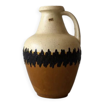 Overview. Vintage blue and off-white glazed ceramic vase from the 1960s mid-century Keramik line. Designed by Friedel for PGH Bürgel; attributes reflect German mid-century design. Design. Elongated vase form with a blue-stripe motif on a creamy ground; stripes appear hand-painted for texture. Glazed ceramic finish with a satin/matte feel and subtle speckling at rims. Dimensions. Height: 20 cm; Width: 13 cm; Depth: 11 cm. Weight: 530 g. Origins. Manufacturer: Friedel for PGH Bürgel; Era: 1960s; German mid-century vase. Material: glazed ceramic; Style: vintage mid-century Keramik.