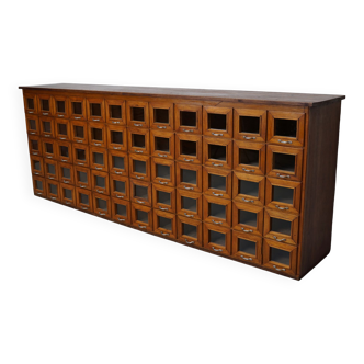 This workshop cabinet with lockers (20 small perforated doors with padlocks) is sold as is. The wooden top has been added to make it a stylish reception counter or a unique shoe cabinet.