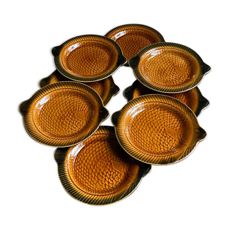 6 flat plates in the shape of fish 🐟 Ceramic Sarreguemines France 60s/70s. Very good condition. Diameter 24cm, length 27.5cm. ✨ also for sale 6 deep plates, a soup tureen and a sauce boat.