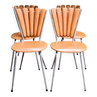 Petal chair in brown skai and metal structure. In skaï camel color. Chromed metal base. Nice backrest in the shape of flower petals. Some marks of time remain, the chrome is slightly pricked in places but their general condition is very good. Seat height 46 cm, width 37 cm, height 87 cm, depth 45 cm.