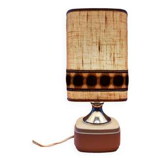 Space age lamp with matt white and aluminum base, cylindrical beige fabric lampshade with aluminum finish. Wire with foot switch. Rare and unique piece in excellent condition except for some discoloration at the top of the lampshade.