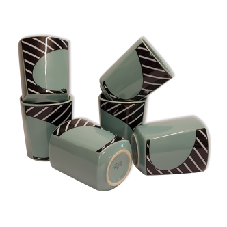 Set of 6 vintage brown and beige ceramic coffee cups with a pattern resembling courreges from the 70s, no snags or chips.