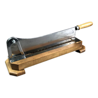 Authentic slicer on wooden base, effective serrated blade, some holes of treated tendrils. As beautiful as it is functional...
