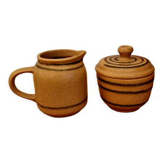 Set of sandstone water butter makers from the poterie du berry (hollow stamp on the back), one with its lid, the other, dark brown wider, which can be used as a jam or sugar bowl. Handcrafted made in france, their glazed enamel is decorated with pretty pearl friezes. Good condition, 9.5x9 and 10.5x7.5 cm.
