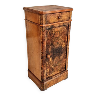 This walnut piece of furniture has the particularity of having a curved front. In the upper part, it has a drawer with a burl walnut veneer front, decorated with a molding around its perimeter and a wooden pull button. The door also has a burl walnut veneer with moldings and a wooden knob. The canted uprights extend into the plinth. At the front, the feet are called hooves. The sides of this bedside table are made of solid walnut. The latter is topped with a gray sainte anne marble which follows the shape of the piece of furniture. ******** period: 1900 perfect condition after restoration in our workshop. Finish: waxed delivery possible, in france and internationally. Maximum dimensions: height: 78 cm width: 44 cm depth: 38 cm reference: 020224.4.