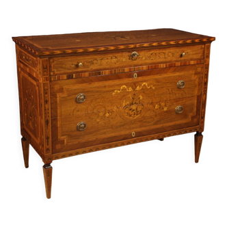 COD 11514. An elegant mid-20th-century Italian dresser. This Louis XVI-style furniture is richly inlaid with walnut, rosewood, maple, palisander, and fruitwood. A high-quality, beautifully sized chest of drawers, it is ideal for a living room or bedroom. It rests on four sturdy inlaid legs shaped like inverted pyramids. The top is embellished with a central decoration featuring musical instruments and playing cards. The sides, the decoration of the two lower drawers, and the band of the top drawer are adorned with folk figures, floral ornaments, and festoons (see photo). The commode comes with three working keys, and is of good capacity and usable. It has recently undergone polishing and conservative restoration, and is structurally sound and in good condition.