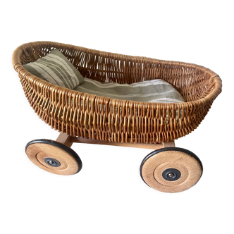 Vintage baby bed designed by Dirk Van Sliedregt for Gebroeders Jonkers, antique cradle. 1960s. Dimensions: 64x96xh113cm. Hand-woven wicker basket-style furniture with handles. A few missing strands on the bed and chips on the legs, but they don't affect its aesthetics or functionality. Very good overall condition. Lots of charm and character. Bright. Ideal for a baby shower gift or photo shoot. I can donate the mattress, cot bumper (BO brand), and duvet, but they are likely vintage and need updating. Delivery to my home or delivery via courier is possible (e.g., €70 to Paris and the Paris region; contact me for other destinations). Scandinavian rattan Moses basket for children.
