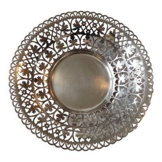 A round silver plated Mappin & Webb serving tray, decorated along the edge with pierced designs. Signed, stamped and numbered on the underside.
