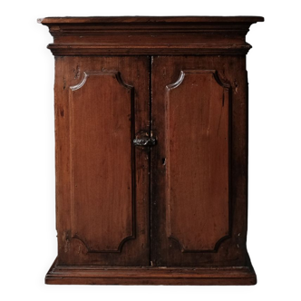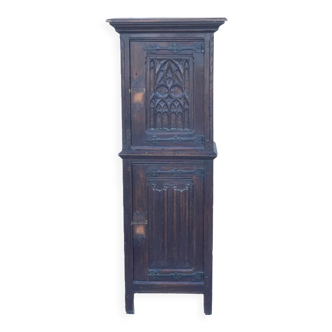 France / 16th century / cabinet / oak / rustic / mid-century. A rare antique rustic tall cabinet with nice patina on the oak wood. With 2 doors with authentic wrought iron hardware and wooden doorknobs. A remarkable piece of artisanal craftsmanship from the 16th century. Handcrafted in solid oak. Behind each door you’ll find a shelve with ample storage space. The sleek tall design and elegant but robust lines ensure that this piece complements both mid-century and traditional eclectic interiors. Ref. 24-0357.